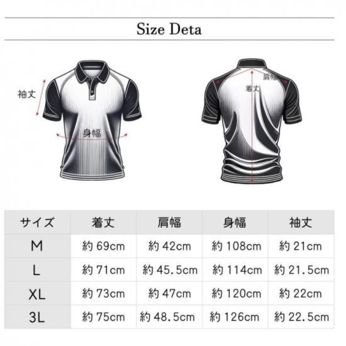 | サイズ | M(着丈 約69cm, 肩幅 約44cm, 胸囲 約108cm, 袖丈 約21cm) L(着丈 約71cm, 肩幅 約45.5cm, 胸囲 約114cm, 袖丈 約21.5cm) XL(着丈 約73cm, 肩幅 約47cm, 胸囲 約120cm, 袖丈 約22cm) 3L(着丈 約75cm, 肩幅 約48.5cm, 胸囲 約126cm, 袖丈 約22.5cm) |