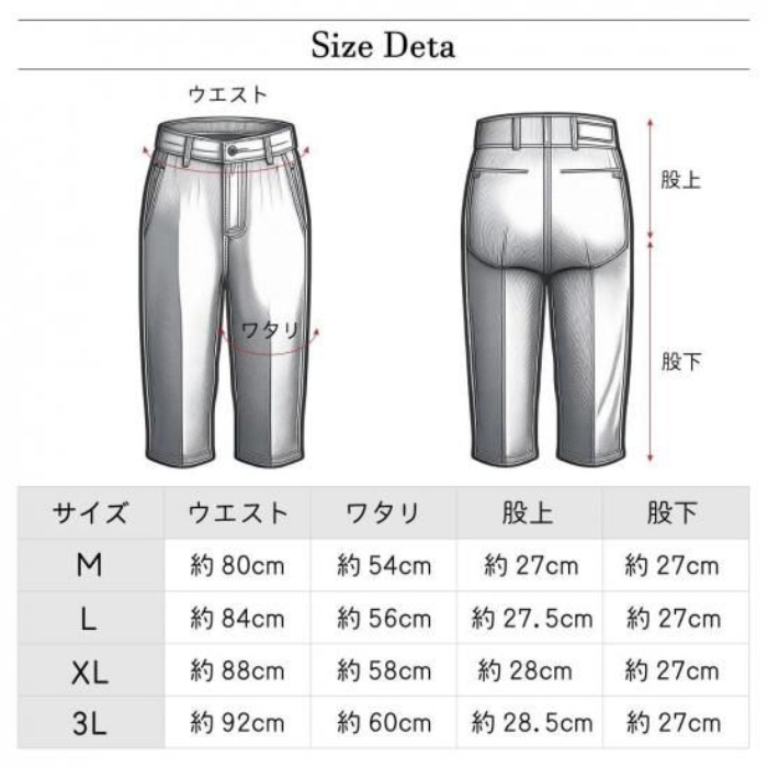 | サイズ | M(ウエスト:約80cm, ワタリ:約54cm, 股上:約27cm,股下:約27cm) |