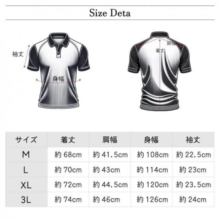 | サイズ | M(着丈 約68cm, 肩幅 約41.5cm, 胸囲 約108cm, 袖丈 約22.5cm) L(着丈 約70cm, 肩幅 約43cm, 胸囲 約114cm, 袖丈 約23cm) XL(着丈 約72cm, 肩幅 約44.5cm, 胸囲 約120cm, 袖丈 約23.5cm) 3L(着丈 約74cm, 肩幅 約46cm, 胸囲 約126cm, 袖丈 約24cm) |