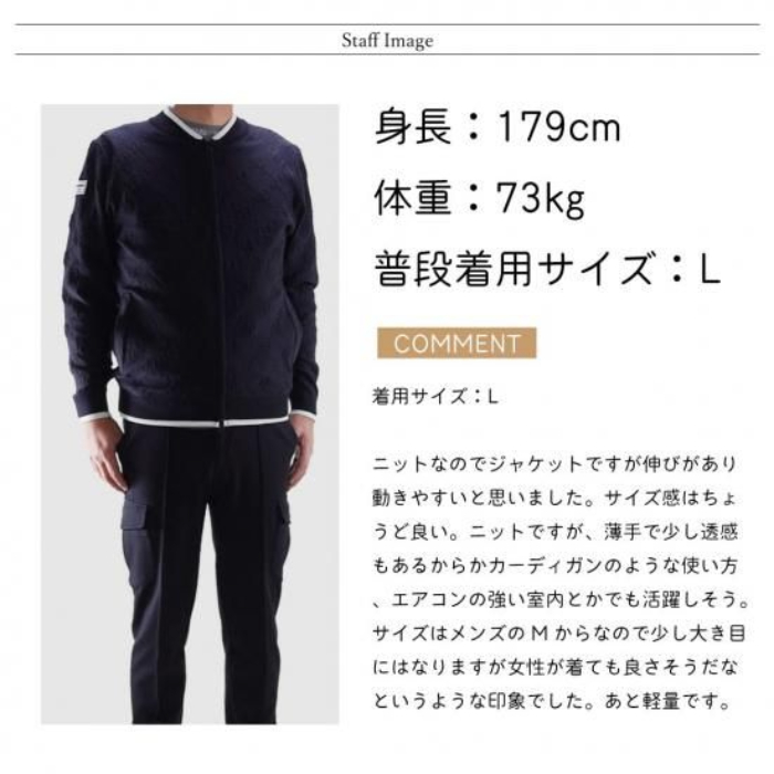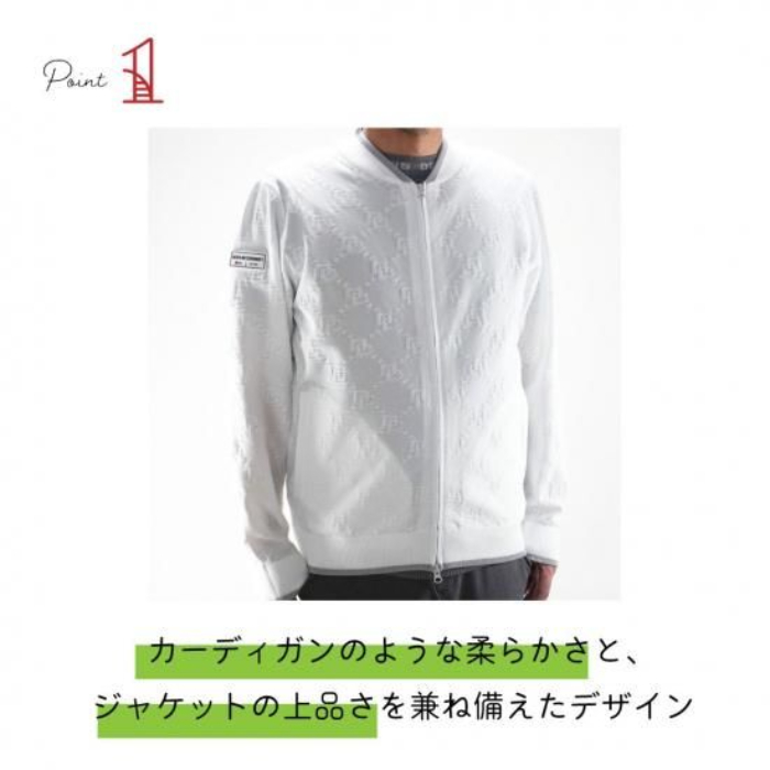 カーディガンのような柔らかさと、ジャケットの上品さを兼ね備えたデザインで、オン・オフどちらのシーンでも活躍。ストレッチ性があり、軽量で動きやすい。