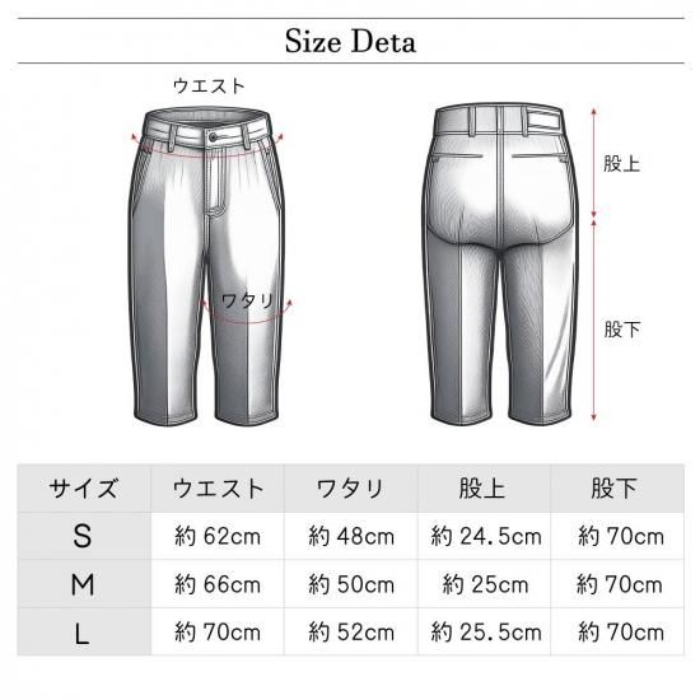 | サイズ | S(ウエスト:62cm, ワタリ:48cm, 股上:24.5cm, 股下:70cm) |